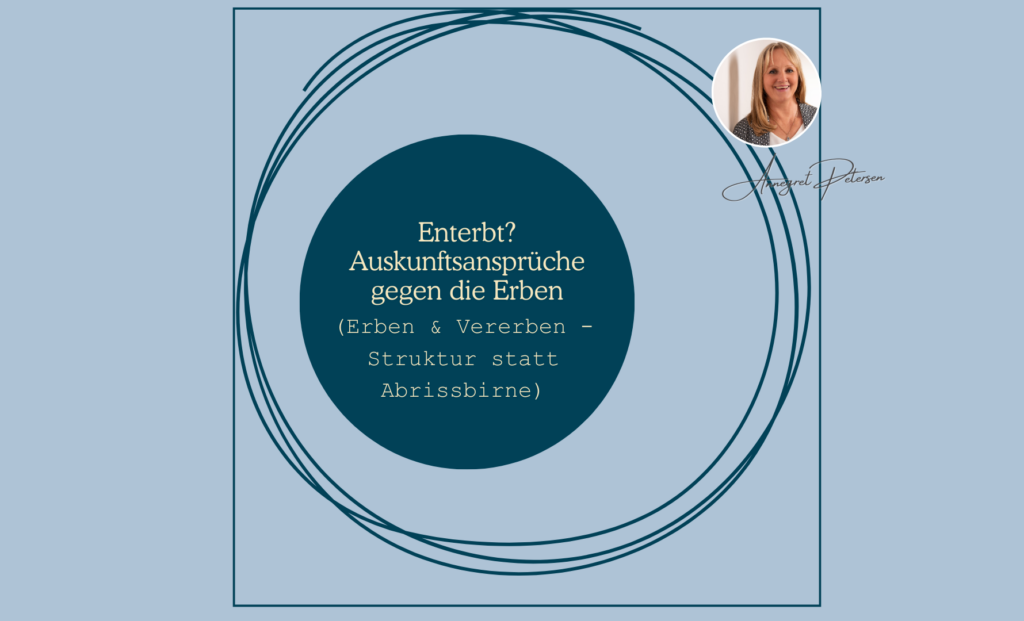 (Erben & Vererben -Struktur statt Abrissbirne) Ein Testament macht häufig nicht alle Hinterbliebenen glücklich. Wer enterbt wurde, möchte zumindest über den Pflichtteil am Nachlass beteiligt werden. Häufig weiß er aber gar nicht, ob er berechtigt ist oder was im Skat ist. Wer erbt ist manchmal semi-motiviert hilfreiche Auskünfte zu erteilen. Pflichtteilsberechtigten steht ein Auskunftsanspruch gegen […]